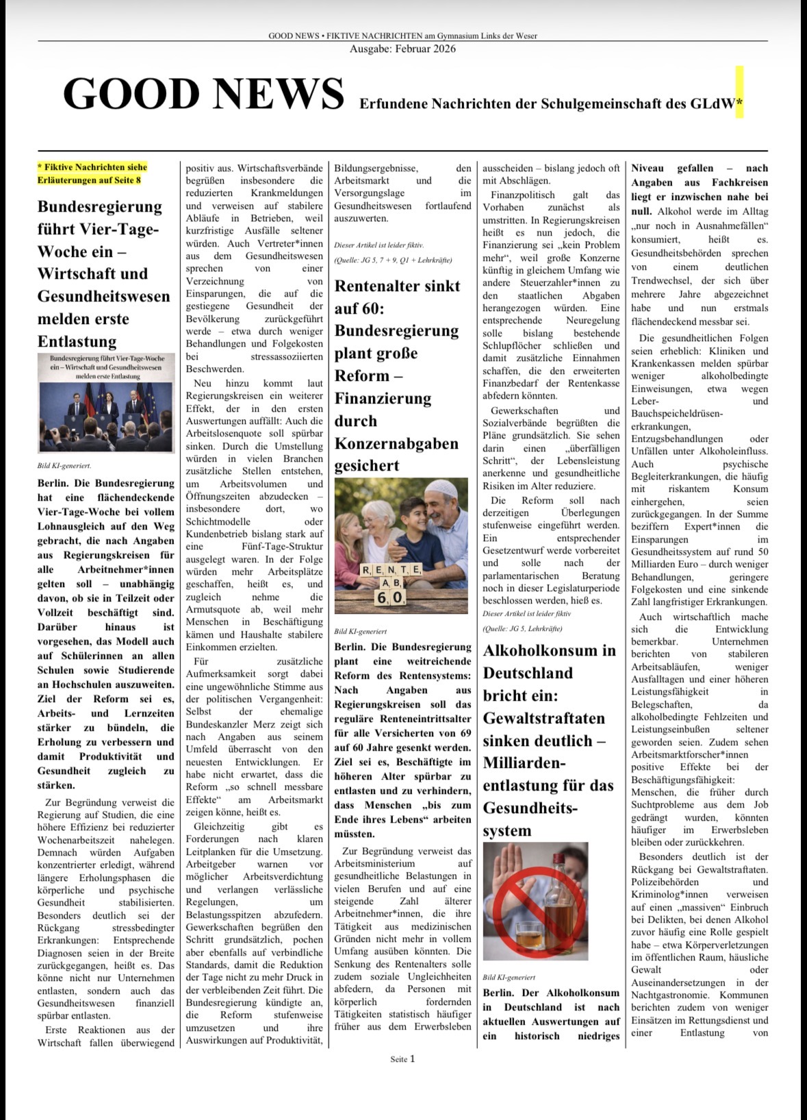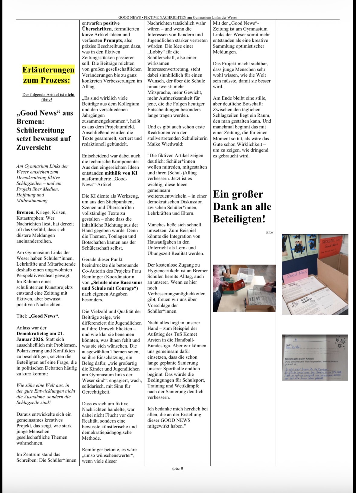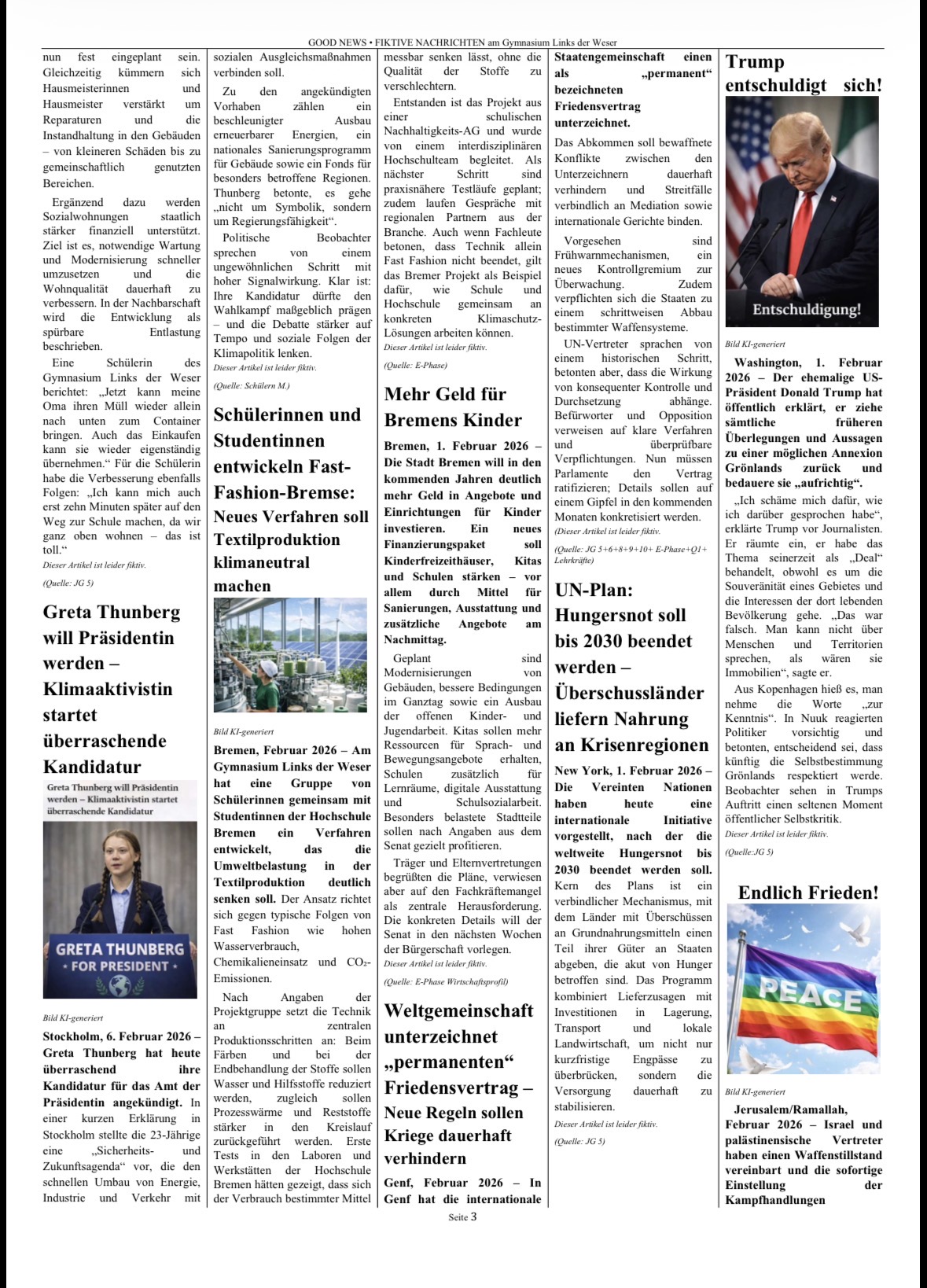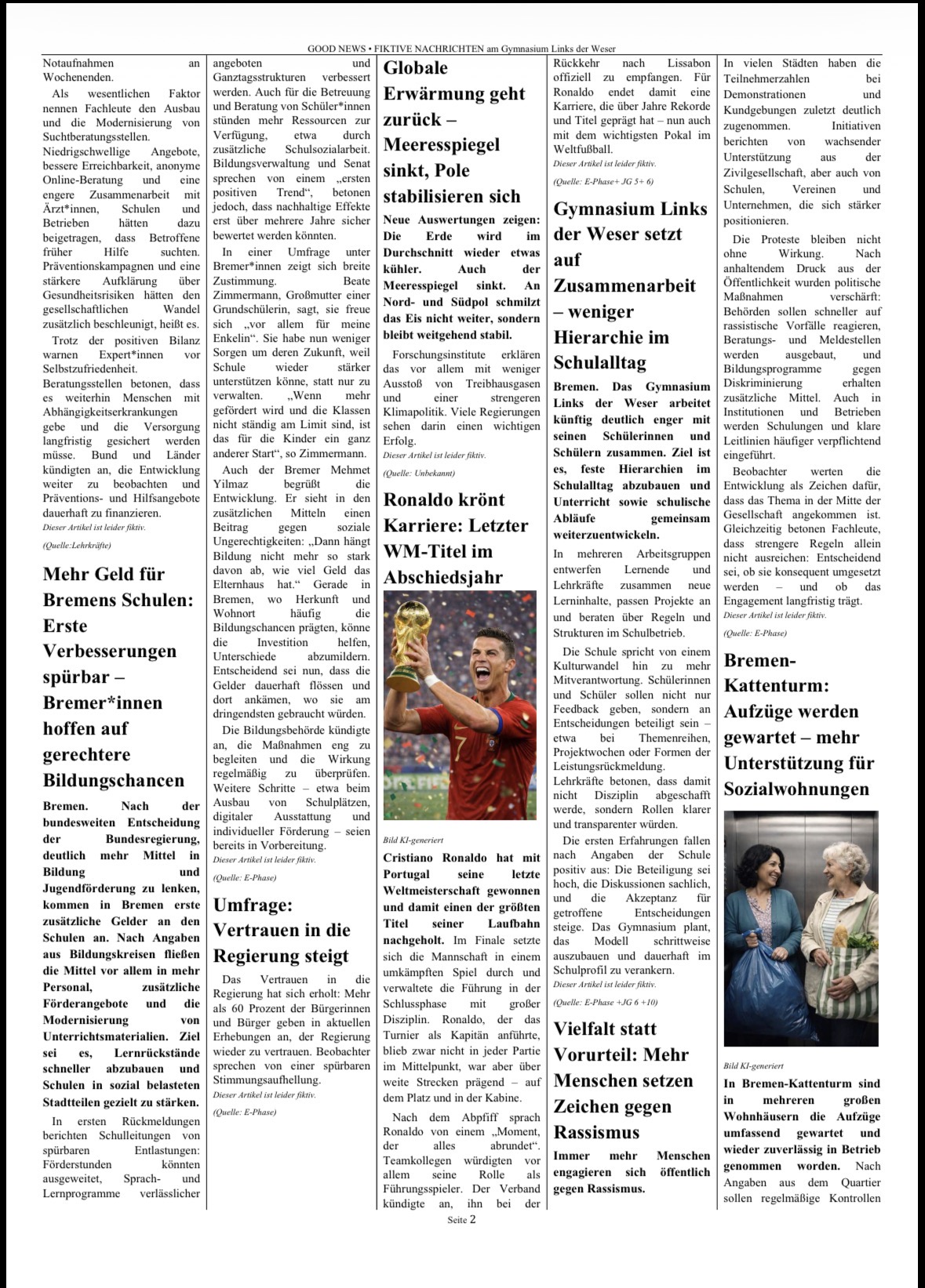 Gemeinsam entstand so eine Zeitung voller „Good News“: eine Sammlung von Visionen, Ideen und positiven Perspektiven auf unsere Gesellschaft. Das Projekt macht deutlich, dass Demokratie nicht nur ein politisches System ist, sondern von Haltung, Engagement und dem Glauben an Veränderung lebt. Ein starkes Zeichen dafür, dass junge Menschen sehr wohl wissen, in welcher Welt sie leben möchten und bereit sind, diese aktiv mitzugestalten.