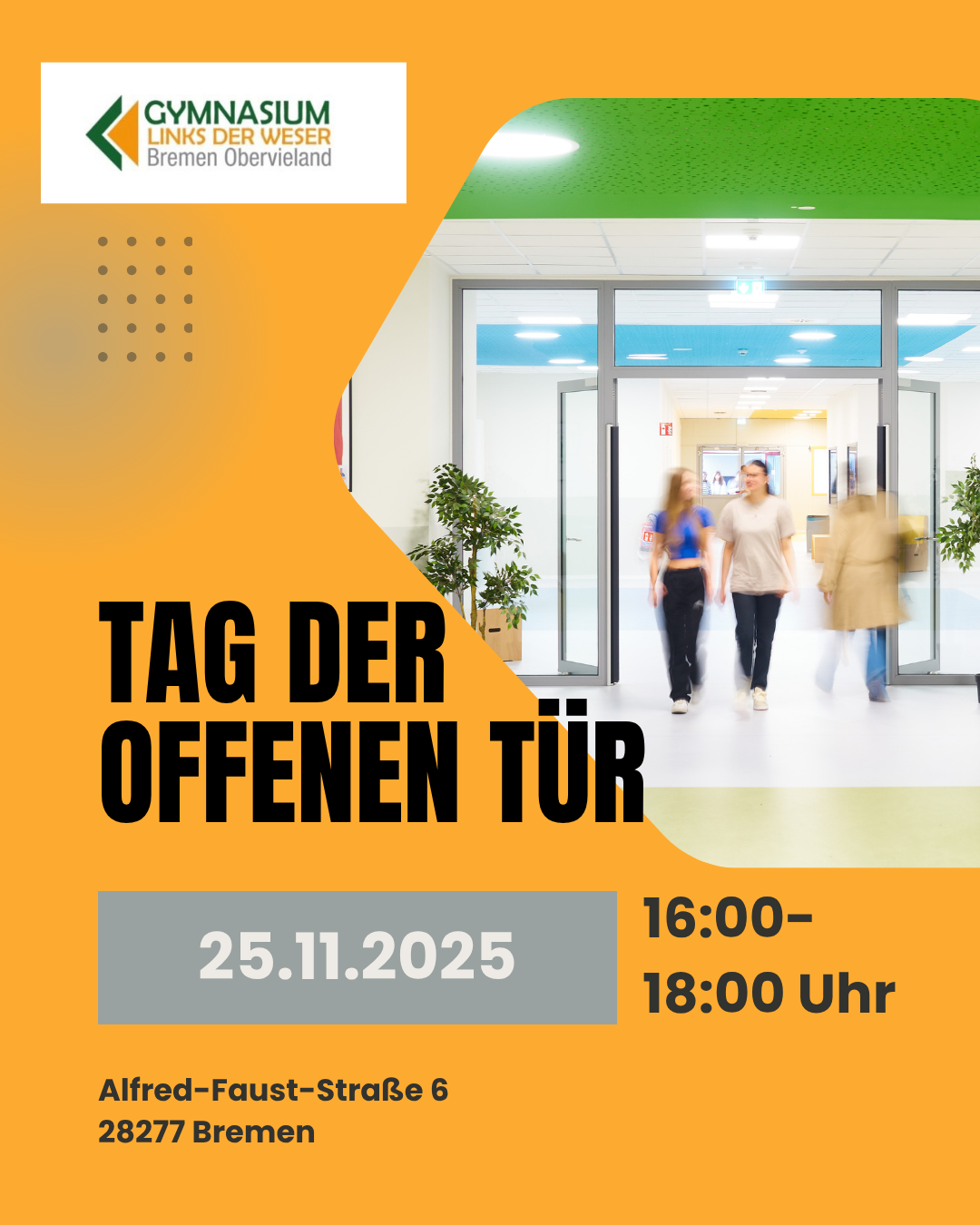 Ende November ist es wieder soweit: Das Gymnasium Links der Weser öffnet am 25.11.25 von 16:00 bis 18:00 seine Türen. Vorgestellt wird das pädagogische Konzept mit einer Vielzahl von Elementen und Angeboten: Differenzierungsangebote in einzelnen Fächern, besondere Förderprogrammen, sportliche Angeboten Ganztagsangebote und viele weitere Aktivitäten werden präsentiert. Mit dabei sind Schüler:innen, Eltern, die Sozialpädagoginnen und Lehrkräfte der Schule, die selbstverständlich für Gespräche bereit stehen.